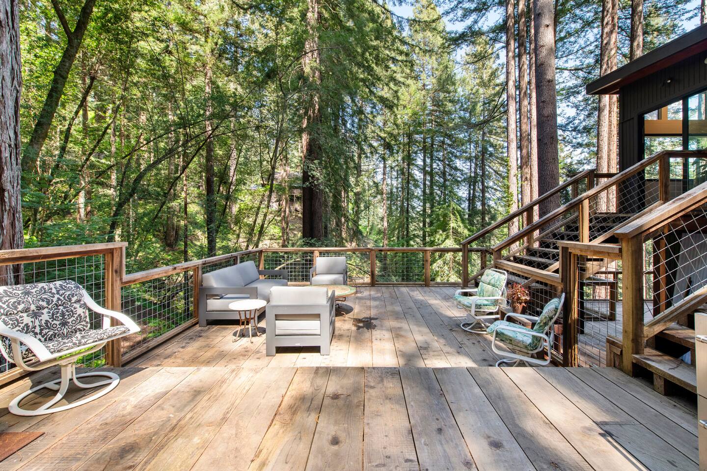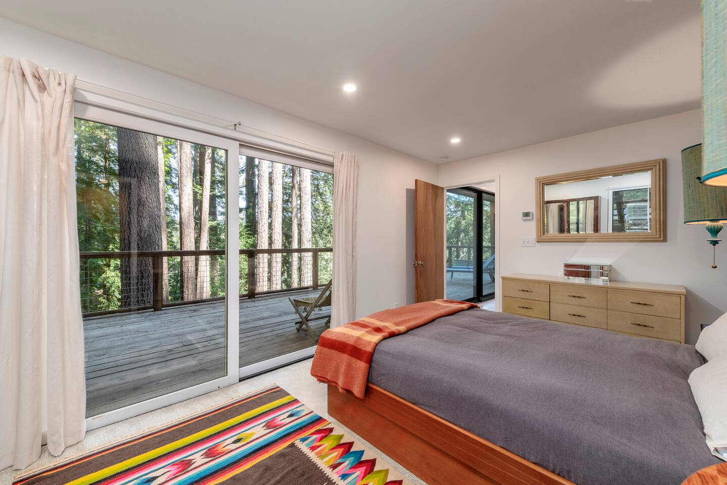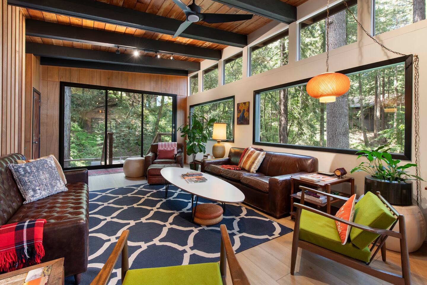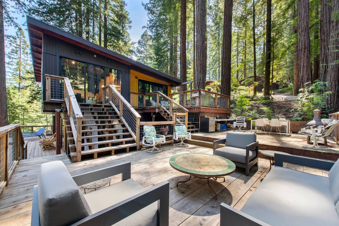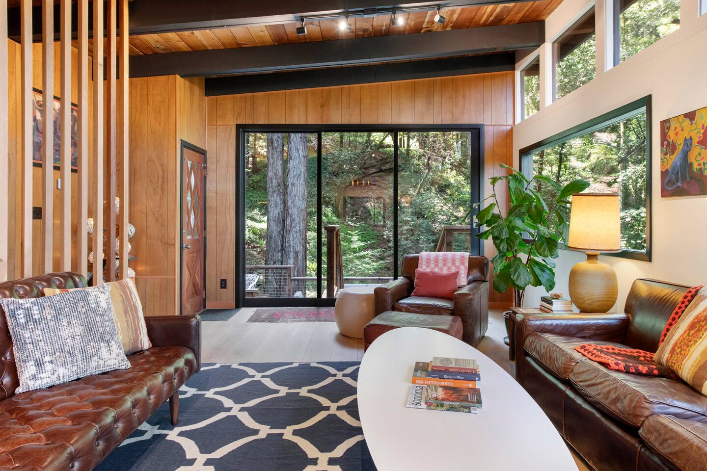 Tucked among towering redwoods, this spacious cabin offers a serene forest retreat where you can slow down, breathe deeply, and reconnect with nature. Step onto peaceful decks surrounded by whispering trees, sip coffee as morning light filters through the canopy, or unwind beneath a sky full of stars. With thoughtful retro-modern touches and the quiet rhythm of Camp Meeker, this home invites you to rest, explore, and savor the stillness. Sleeping arrangements Designed to host up to four guests, the cabin features two inviting bedrooms and three full bathrooms. The primary bedroom on the lower level includes a private en-suite bath and forest views, while the second bedroom provides a comfortable space for restful nights. Living spaces The open-plan upper floor includes a bright living area with mid-century décor, a dining space for shared meals, and a full bathroom for convenience. Downstairs, a separate den offers an additional lounge area for reading or quiet time, along with access to another deck overlooking the woods. Kitchen & dining A fully equipped kitchen makes cooking easy with all the essentials, including a refrigerator, stove, oven, microwave, coffee maker, and more. Prepare meals with forest views, then gather at the dining table to enjoy them together. Outdoor living Two expansive decks create seamless indoor-outdoor flow. Lounge on outdoor furniture, enjoy meals at the dining area, or fire up the BBQ grill surrounded by nature. The private patio and sun loungers invite slow mornings and lazy afternoons in the fresh mountain air. Comfort & convenience The cabin provides fast WiFi, a dedicated workspace, washer and dryer, heating, and bathroom essentials. While there’s no TV or air conditioning, the setting encourages relaxation away from screens. Cell service may be limited, but WiFi remains reliable throughout. Safety & security Equipped with smoke and carbon monoxide alarms, a first aid kit, fire extinguisher, and an exterior Ring doorbell camera at the front, the home ensures peace of mind during your stay. Parking & access Guests enjoy free parking on-site and additional street parking if needed. The private entrance and lockbox self check-in offer convenience and privacy from arrival to departure. Neighborhood Located near the Russian River and just a short drive from Occidental and Sebastopol, the cabin provides easy access to Sonoma County’s scenic wineries, breweries, and hiking or biking trails. Surrounded by redwoods and wildlife, it offers both seclusion and proximity to local adventures. Perfect for Couples, small families, and pet owners seeking a pet-friendly escape in the heart of the forest. Whether you’re here to write, explore, or simply rest among the redwoods, this Camp Meeker hideaway offers the space and tranquility you’ve been craving.